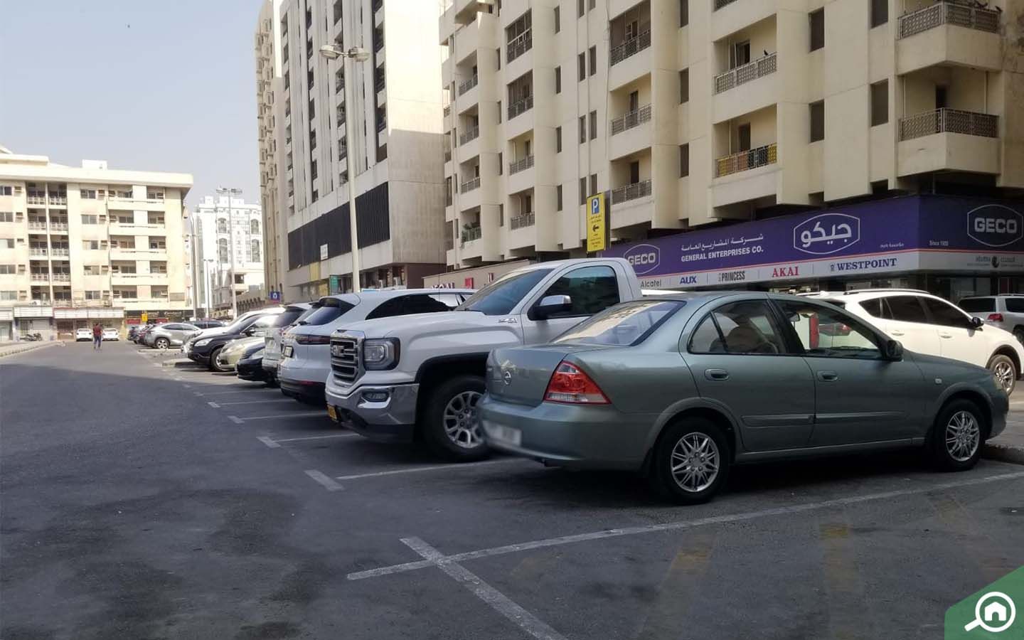 There is covered parking in Al Arooba Building. Each unit gets at least one vehicle parking space.