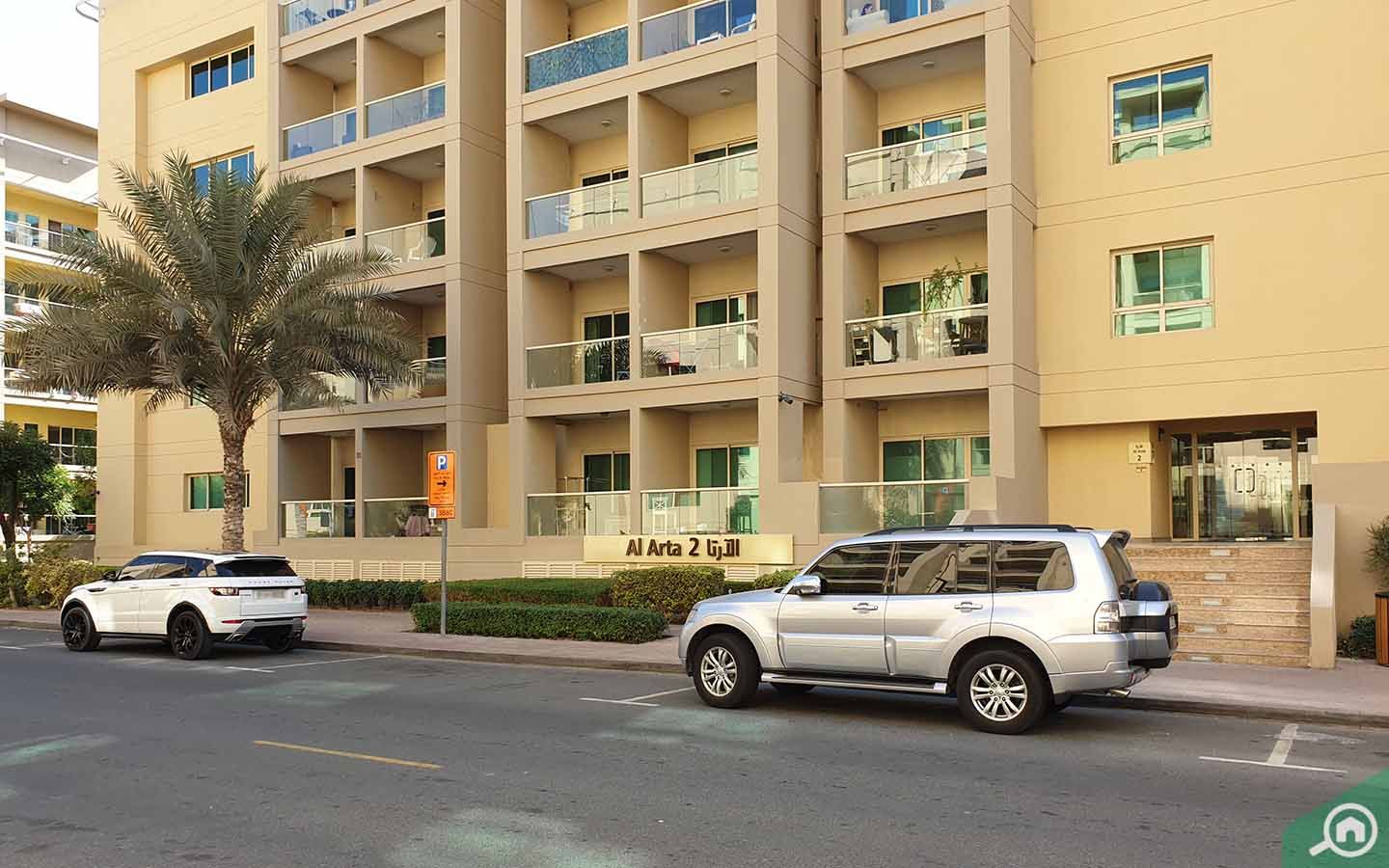 There is ample parking space in Al Arta 4 for residents. The building offers allocated spots for each unit in the basement. The street outside the building also features empty spaces where visitors can park their cars.