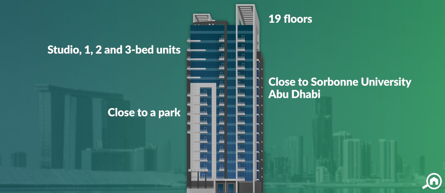 The tower has 19 floors which have 73 residential units that are divided into studio, 1, 2 and 3-bedroom apartments in Al Noor Tower. The building features eight studio flats, nine 1-bedroom apartments, thirty one 2-bed flats and twenty five 3-bedroom apartments.