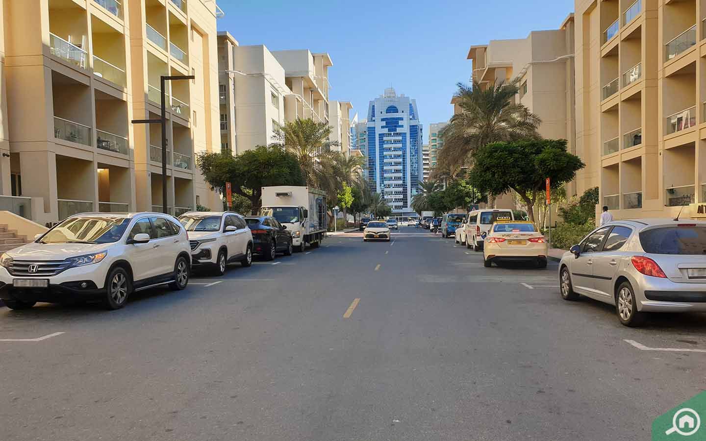 يتمتع السكان بتوفر مواقف سيارات مظللة في طابق التسوية الذي يمكن الوصول إليه من الجهة اليسرى للمدخل الرئيسي، حيث يتم تخصيص موقف سيارات واحد على الأقل لكل شقة، أما بالنسبة للضيوف فيمكنهم صف سياراتهم في مواقف السيارات مدفوعة الأجر خارج المبنى.