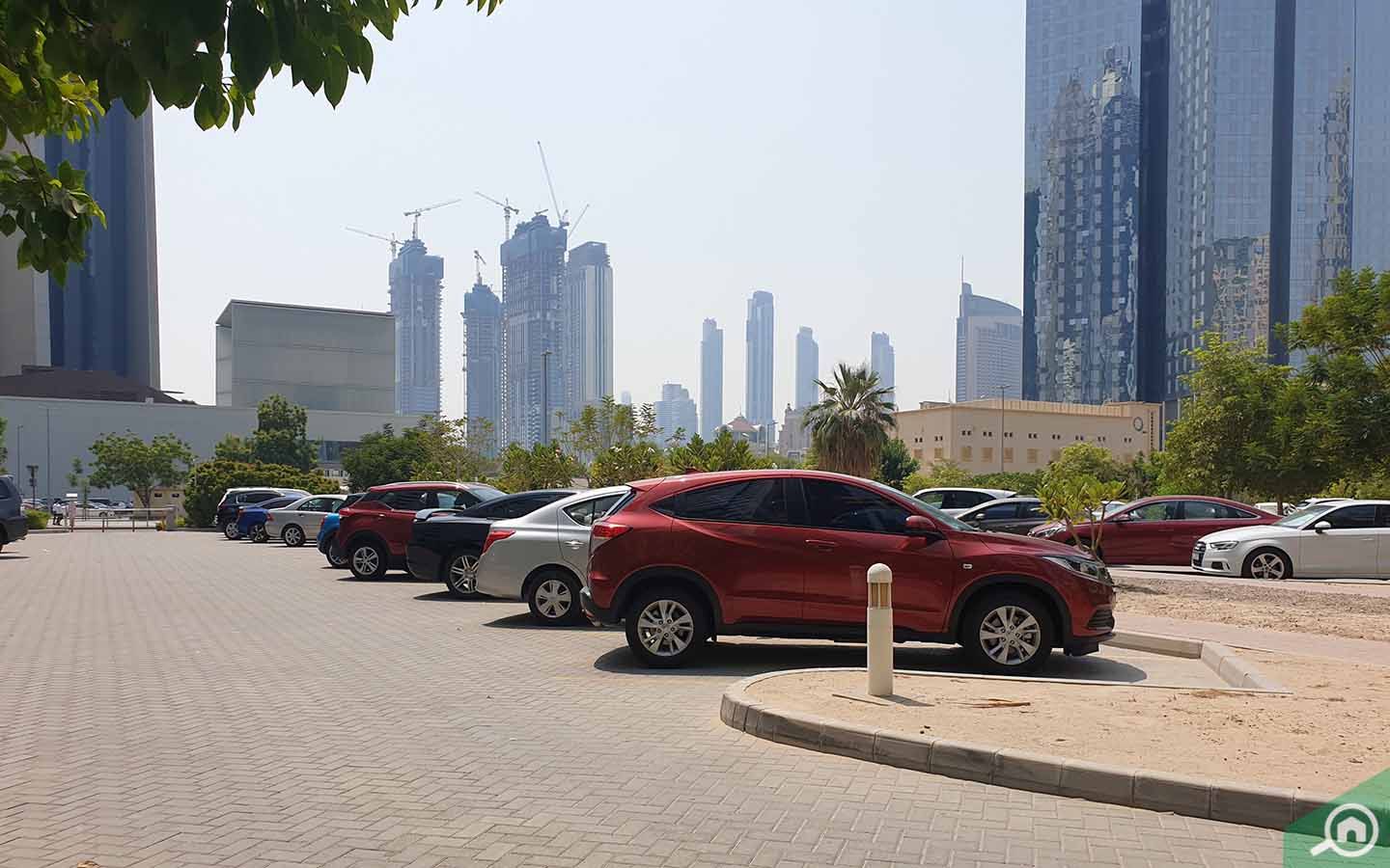يتضمن المبنى مواقف مجانية للسيارات للمقيمين والزوار مزودة بخدمة صف السيارات، كذلك تتوفر العديد من مواقف السيارات في شارع الشيخ زايد.
