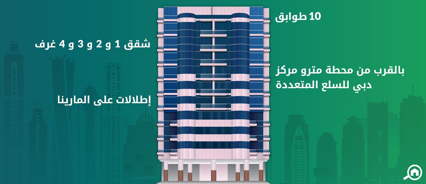 يبلغ ارتفاع المبنى 41 متراً ويشتمل على 10 طوابق، كما يضم مجموعة من الشقق المتاحة بخاصية التملك الحر، والتي تتنوع بين شقق غرفة وصالة و شقق غرفتين وصالة و شقق ثلاث غرف وصالة و فلل من أربع غرف وصالة.