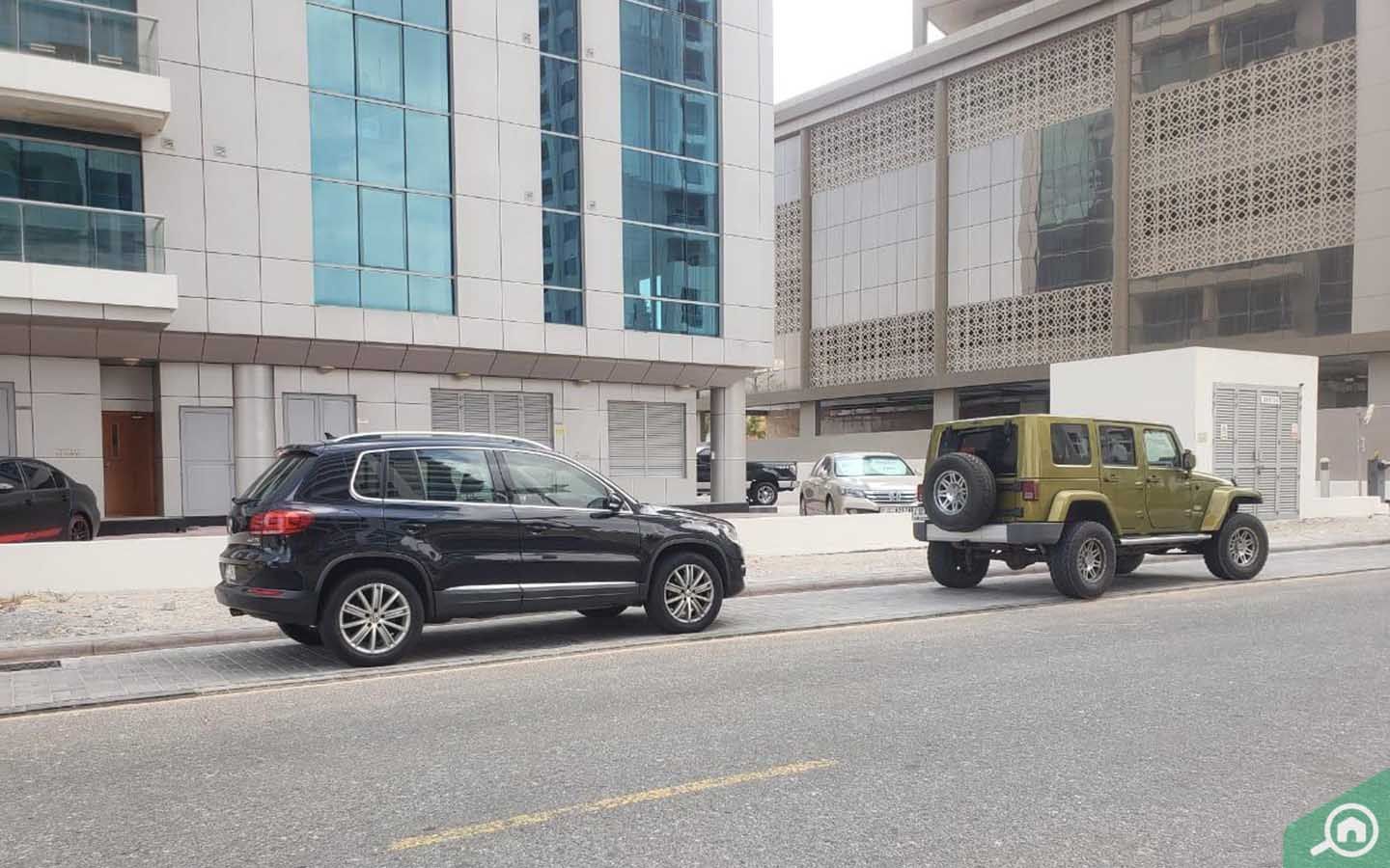 يستطيع السكان صف سياراتهم في الموقف المظلل للبرج، بينما يمكن للزوار صف سياراتهم في الخارج.