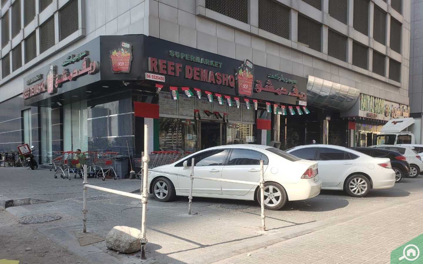 يضم البرج في الطابق الأرضي سوبر ماركت ريف دمشق، وكذلك سوبر ماركت البيت السوري، كما وتحتضن المنطقة العديد من محلات السوبر ماركت الواقعة على بعد 5 دقائق سيراً على الأقدام من البرج. فيما يلي نذكر بعضها:
