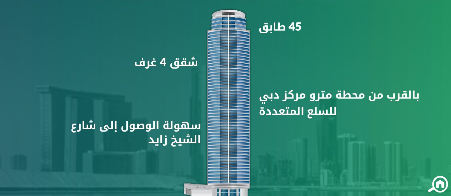 يتألف برج هورايزون دبي مارينا من 45 طابق، ويوفر مختلف المرافق الخدمية المميزة، هذا ويبلغ ارتفاعه 623 قدم. تم تطوير البرج في عام 2006 بتصميم من ارنكو للاستشارات المعمارية والهندسية، ويوفر مجموعة مميزة من الشقق العصرية والتي يبلغ عددها 162 شقة سكنية تتنوع بين 154 شقة أربع غرف وصالة و 8 شقق دوبلكس أربع غرف بتصاميم داخلية فاخرة.