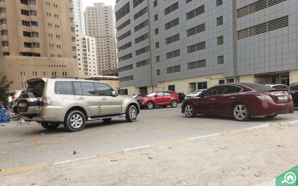 توفر البناية ثلاثة طوابق مظللة وآمنة تم تخصيصها لمواقف السيارات، كما يستطيع الزوار صف سياراتهم في مواقف السيارات الخارجية.