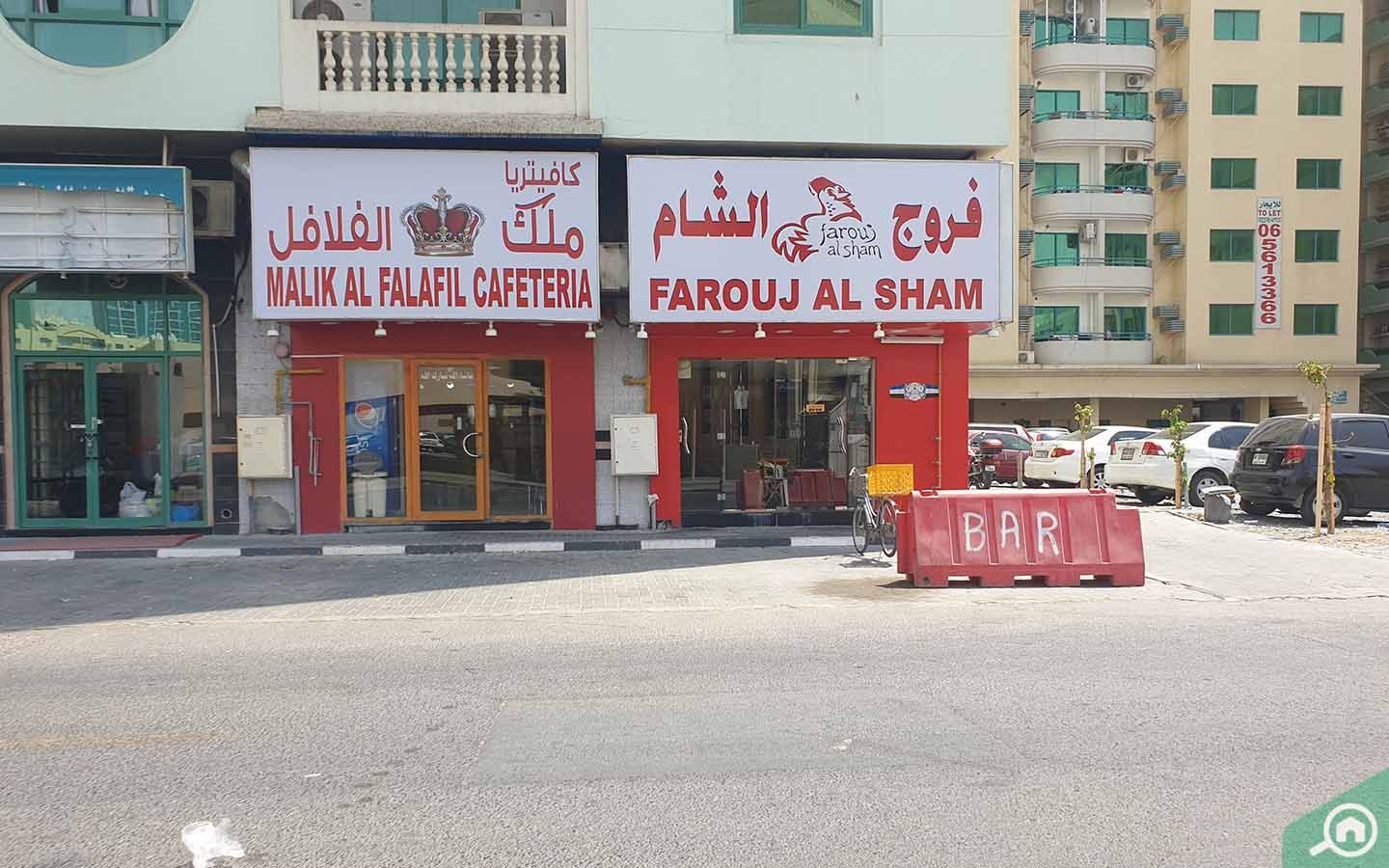 يحتوي الطابق الأرضي من البناية على كافتيريا ملك الفلافل ومطعم فروج الشام.