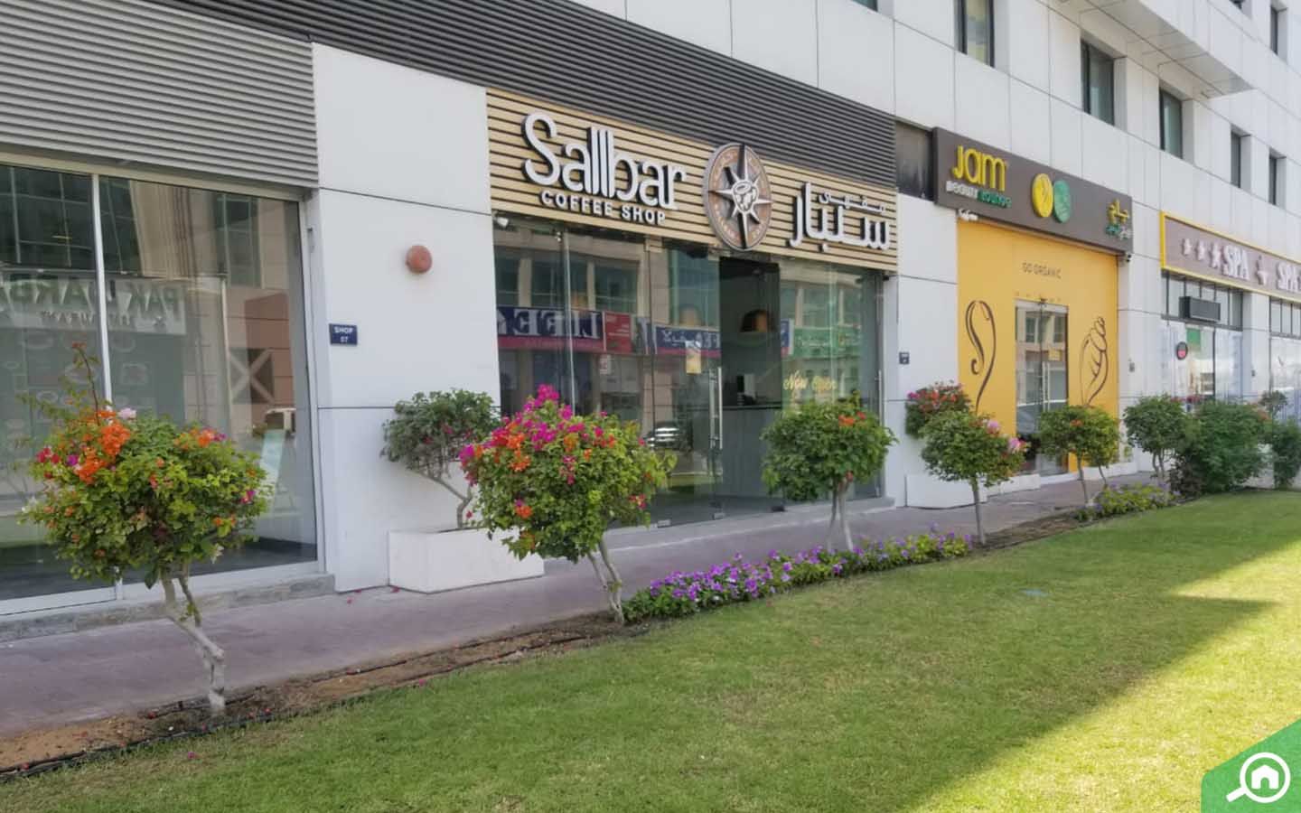 يضم الطابق الأرضي من البناية مقهى سلبار ويقدم المشروبات الساخنة والباردة والحلويات والسندويشات. أما المطاعم القريبة فنذكر منها: