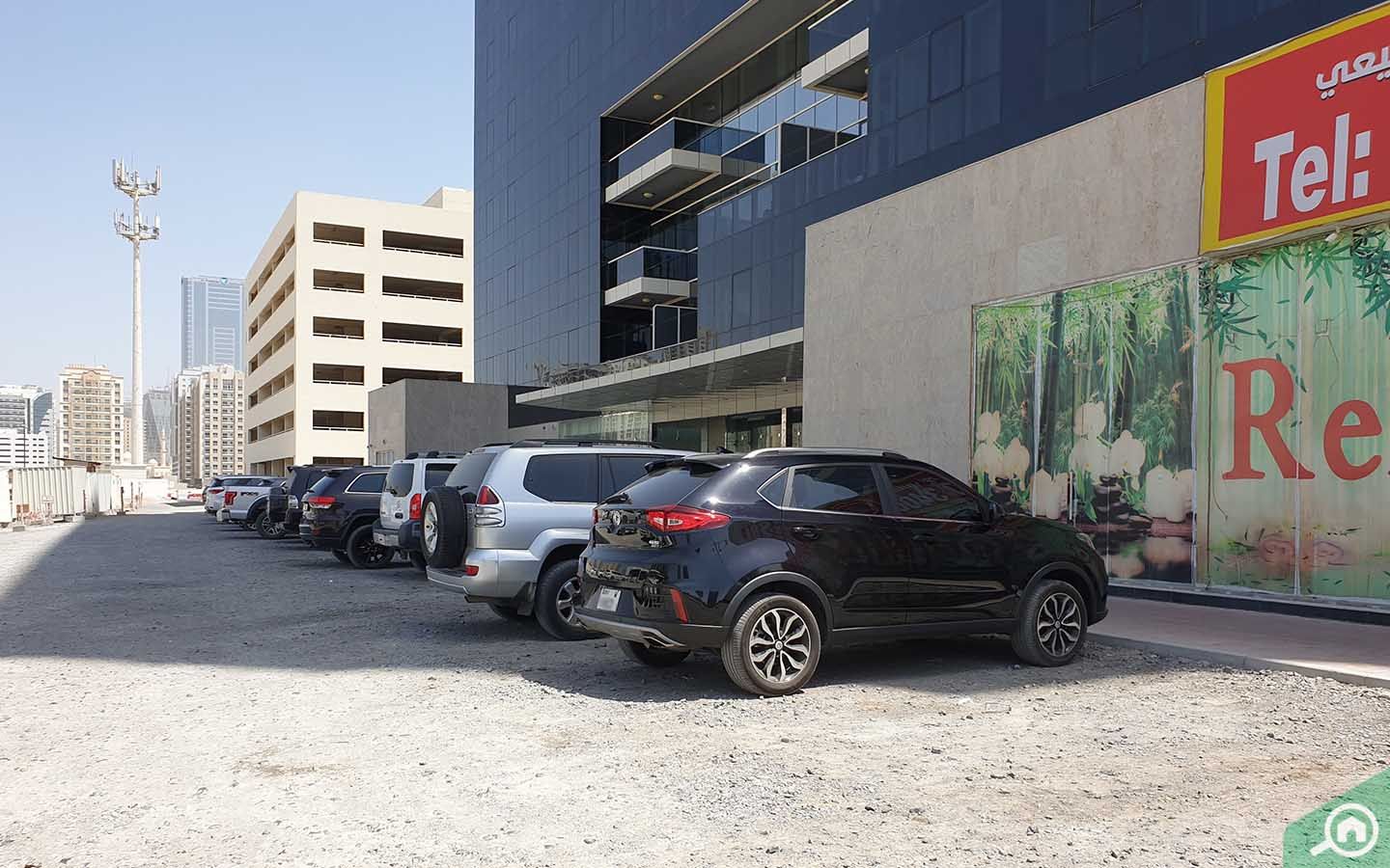 تضم البناية طابقين لمواقف السيارات مخصصة للمقيمين، كما يمكن للسكان والزوار صف سياراتهم خارج البناية في الشارع أو في مواقف السيارات المتاحة بالأجرة.