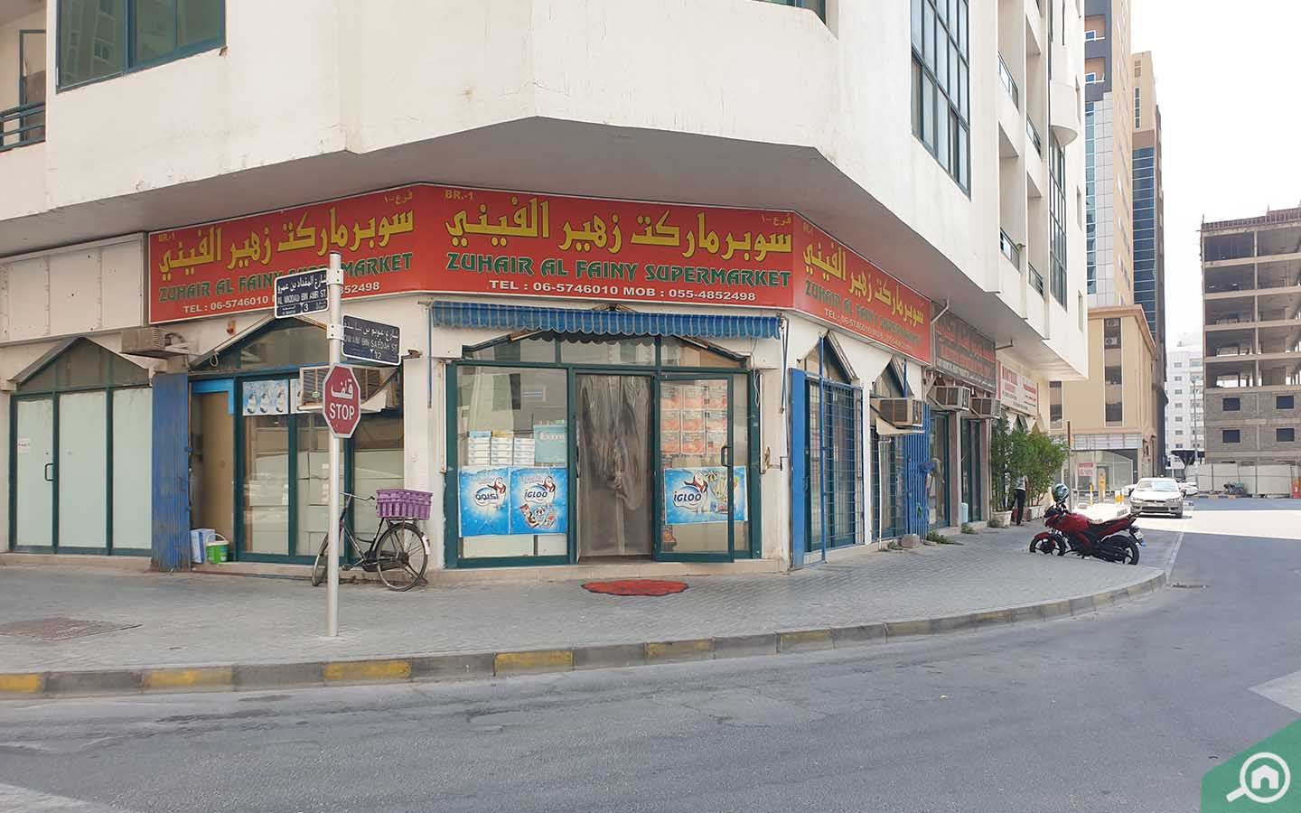 يضم الطابق الأرضي للبناية سوبر ماركت زهير الفيني الذي يلبي احتياجات السكان المختلفة من منتجات البقالة. ينصح السكان أيضاً بالتبضع من محلات بقالة وسوبر ماركت قريبة مثل: