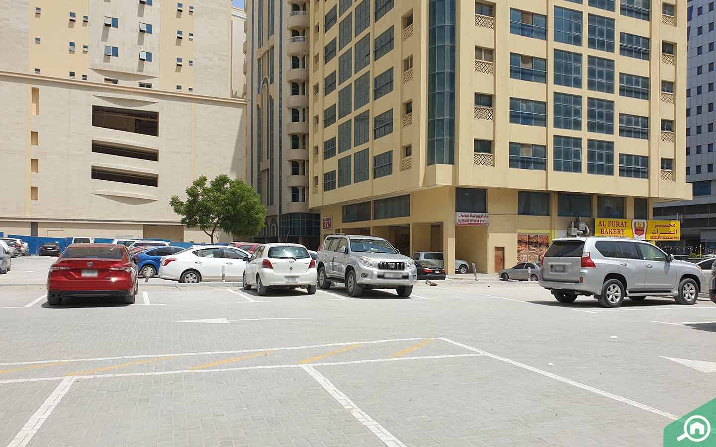 توفر البناية طابقين مخصصين لمواقف السيارات، بحيث يتم تخصيص موقف سيارات واحد على الأقل لكل وحدة سكنية، كما يمكن للضيوف والزوار صف سياراتهم في الشارع.