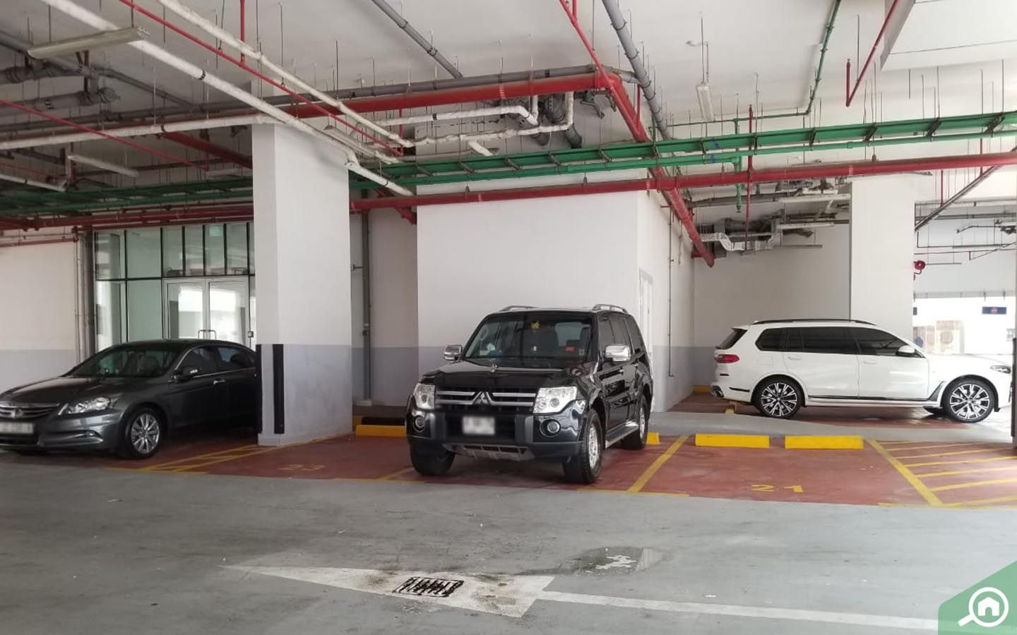 يتم تخصيص موقفين للسيارات لشقق ثلاث غرف وصالة، بينما تُمنح شقق غرفة وصالة و شقق غرفتين وصالة موقف سيارات واحد، وجميع هذه المواقف مظللة لحماية السيارات من أشعة الشمس، كما تتوفر أيضاً مواقف سيارات متاحة بالأجرة ومساحات مفتوحة خارج المبنى حيث يمكن للزوار صف سياراتهم.