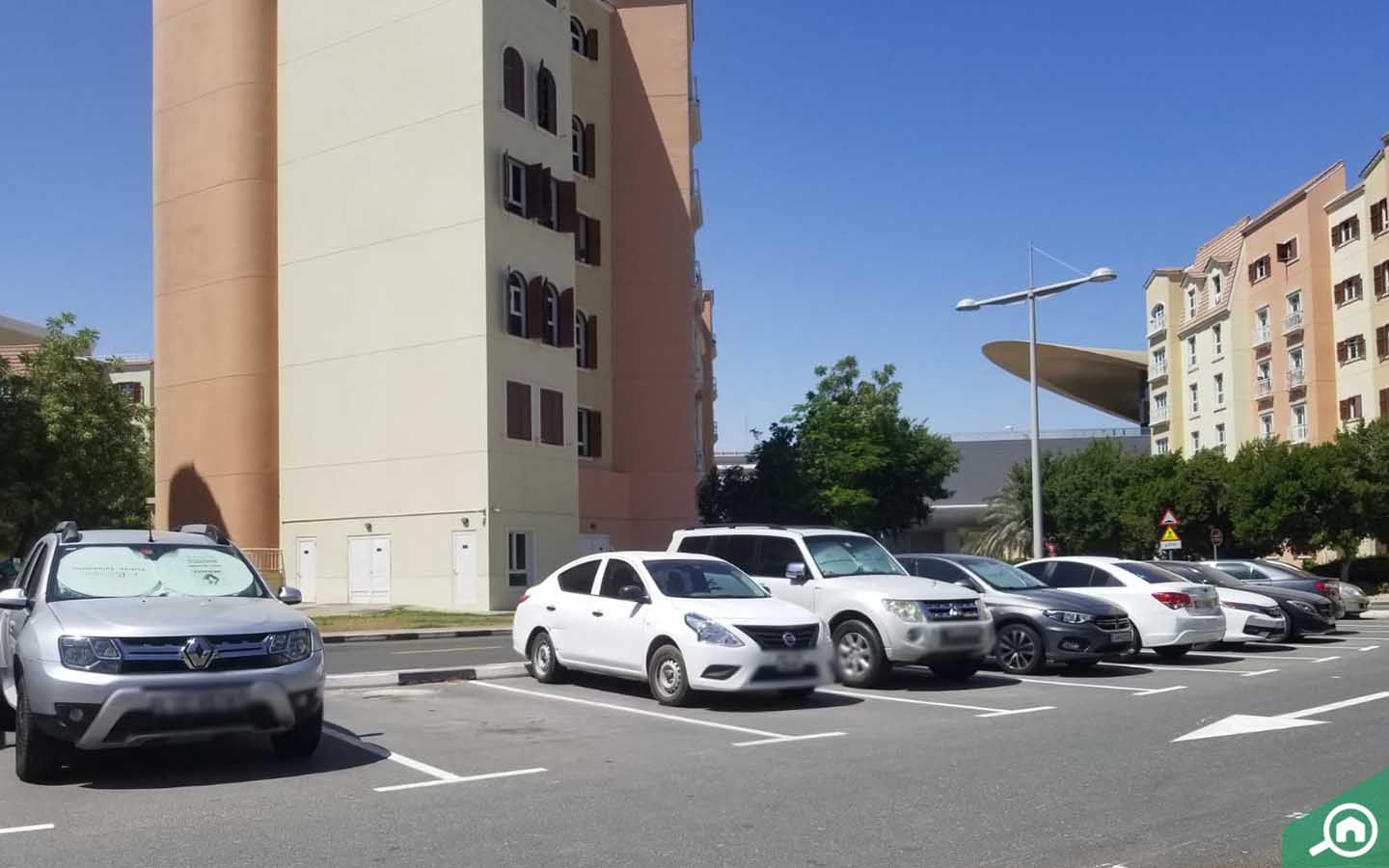 تضم البناية موقف سيارات مظلل للسكان، وتتوفر خارجها مساحات يمكن للزوار صف سياراتهم فيها.