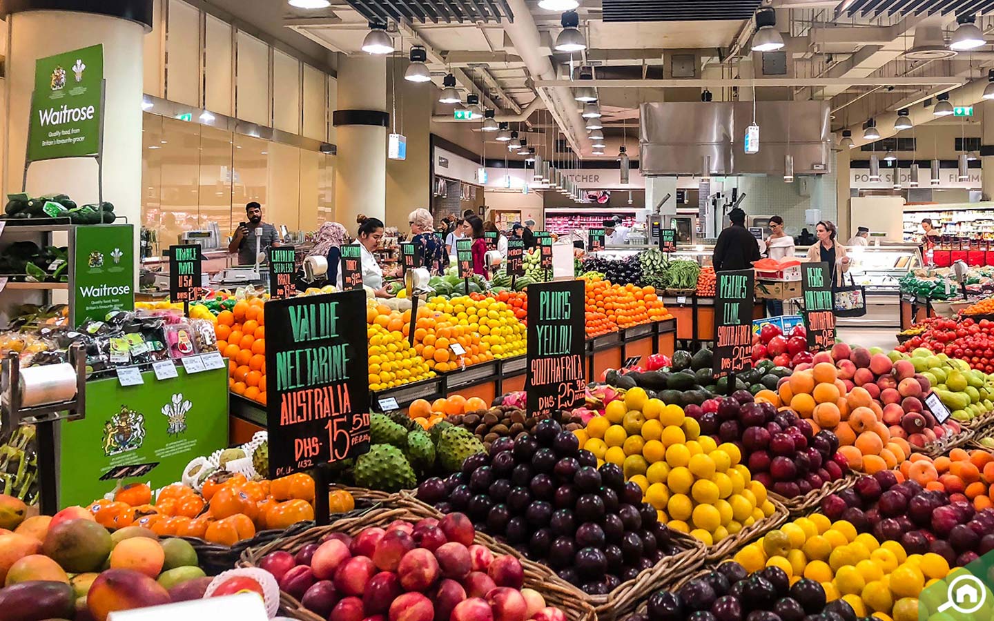 يشتمل دبي مارينا مول على سوبر ماركت ويتروس الذي يوفر الألبان والأجبان والقهوة والزيوت والخضار والفواكه واللحوم والدواجن والمخبوزات الطازجة وغيرها الكثير.