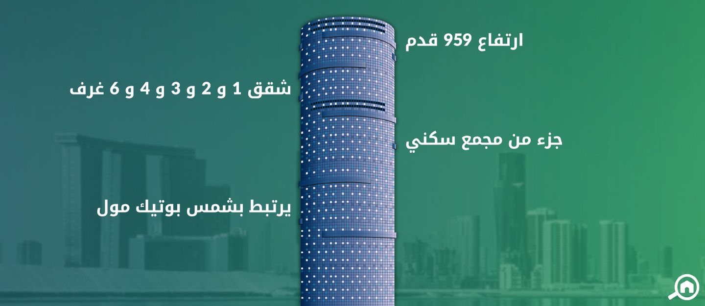 يضم البرج مجموعة من الوحدات السكنية مثل شقق 1-4 غرف وصالة و بنتهاوس بالإضافة إلى عقارات تجارية ومكاتب، وتوفر كل وحدة في البرج إطلالة بانورامية خلابة على جزيرة الريم والخليج العربي. يشترك البرج مع برج صن بمنصة استنادية (بوديوم) ويضم البوديوم مجموعة منوعة من المرافق الترفيهية مثل المسابح ونادي اللياقة البدنية والمجمع الرياضي، إضافة إلى مجمع تجاري ضخم يدعى باسم شمس بوتيك مول.