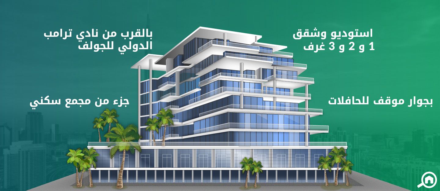 تتوفر شقق استوديو وشقق غرفة وصالة وغرفتين وصالة و3 غرف وصالة، إلى جانب 8 شقق تاون هاوس مؤلفة من غرفتين. تضم جميع الشقق أرضيات سيراميك بيضاء ونوافذ زجاجية بإطلالة بانورامية، إلى جانب خط كيبل واسع النطاق وشرفة مطلة على ملعب ترامب الدولي للغولف.