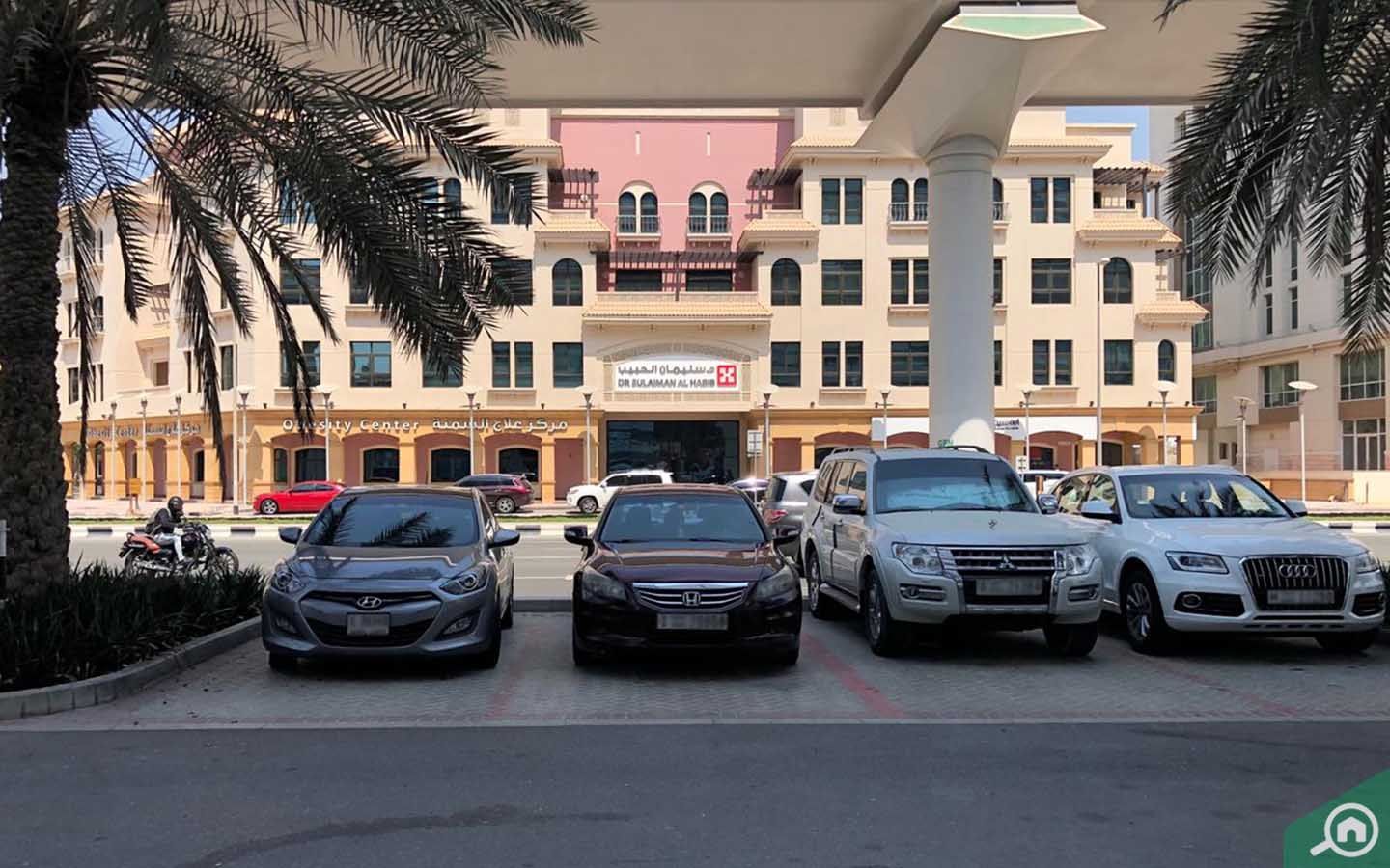 يمكن للسكان صف سياراتهم في المواقف المظللة والمنظمة خارج المبنى.