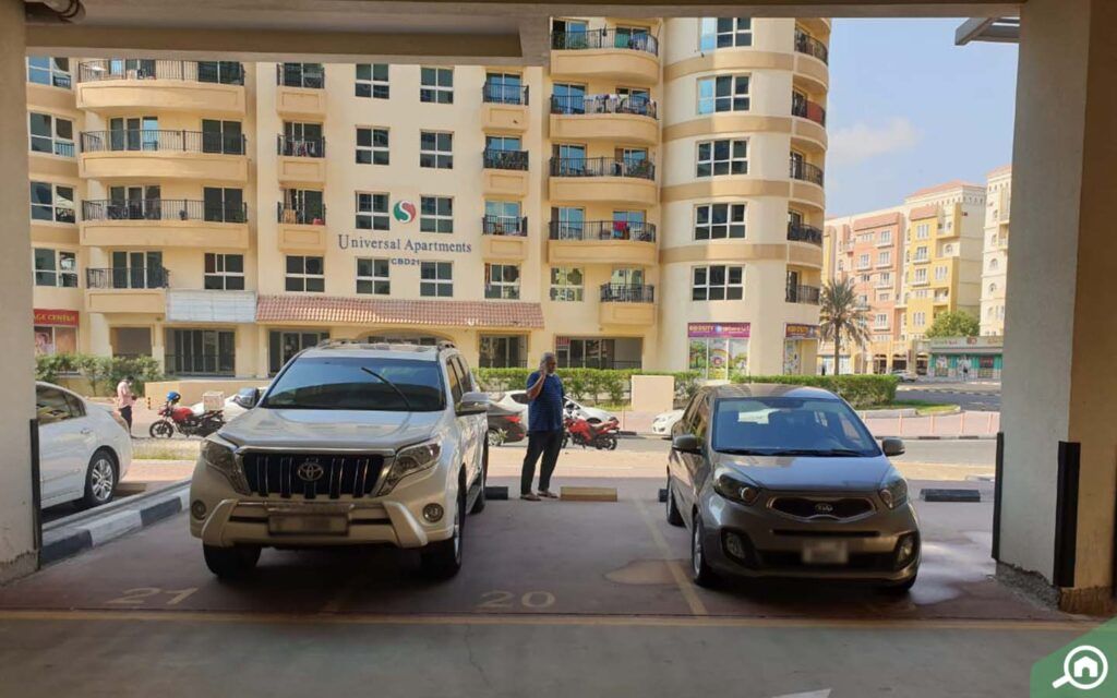 يتمتع السكان بتوفر مواقف سيارات مظللة، حيث يتم تخصيص موقف واحد على الأقل لكل شقة حسب المساحة، أما بالنسبة للضيوف فيمكنهم الاستفادة من مواقف السيارات الخارجية في الشارع.