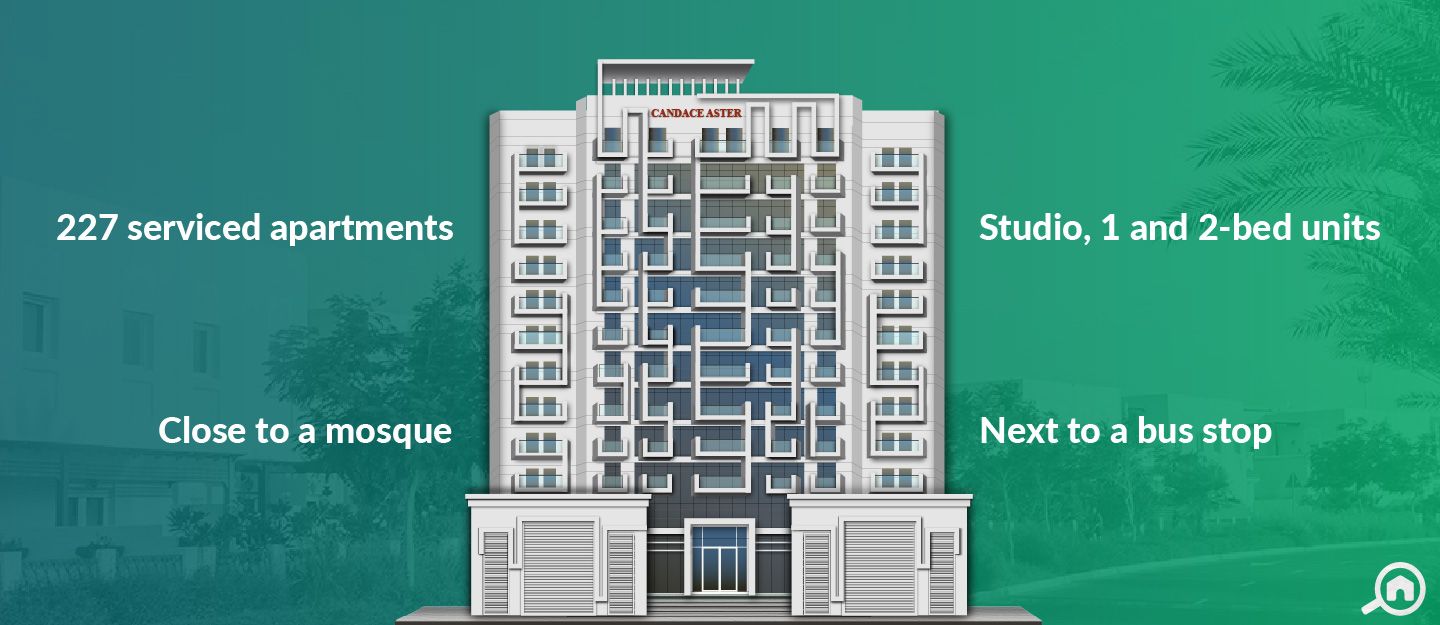 Several apartment buildings are located at a short walk from Candace Aster. The nearest are Azizi Freesia at a 1-minute walk, Daisy by Azizi at a 2-minute walk and Victoria Residency at a 5-minute walk.