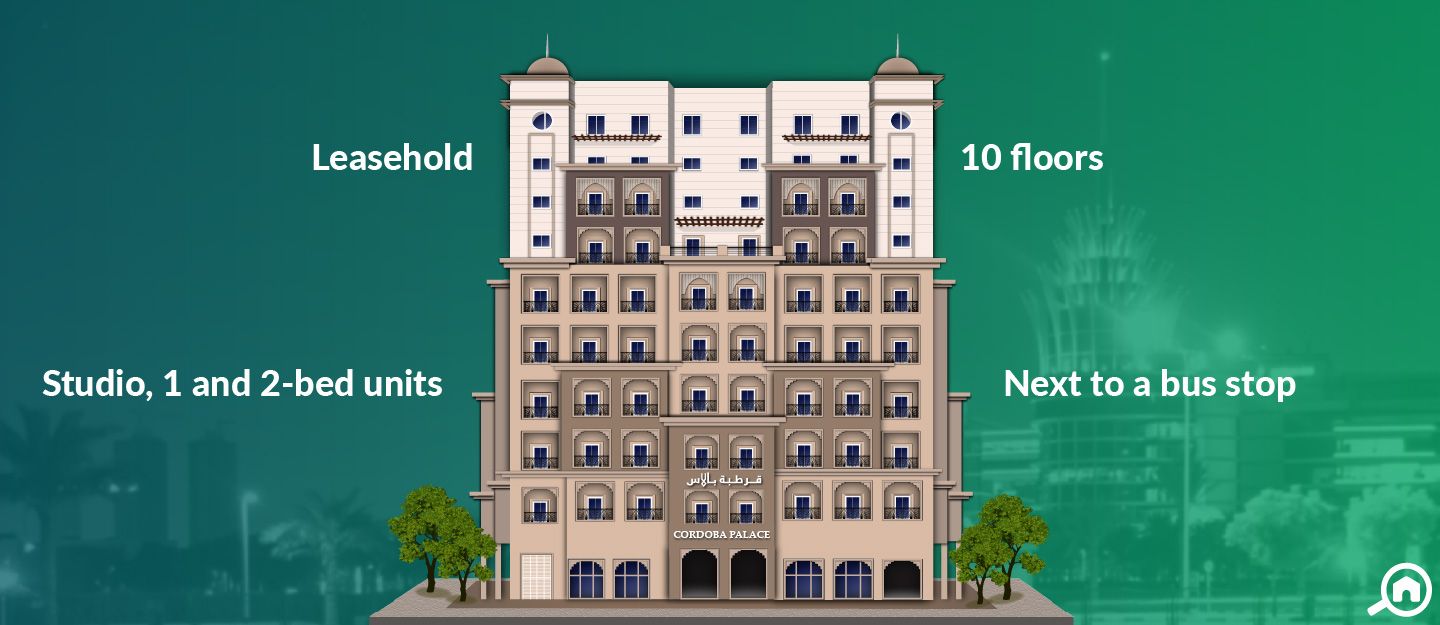 Cordoba Palace offers studios, 1 and 2-bedroom apartments. All these residential units come with built-in wardrobes in the master bedroom and a balcony.