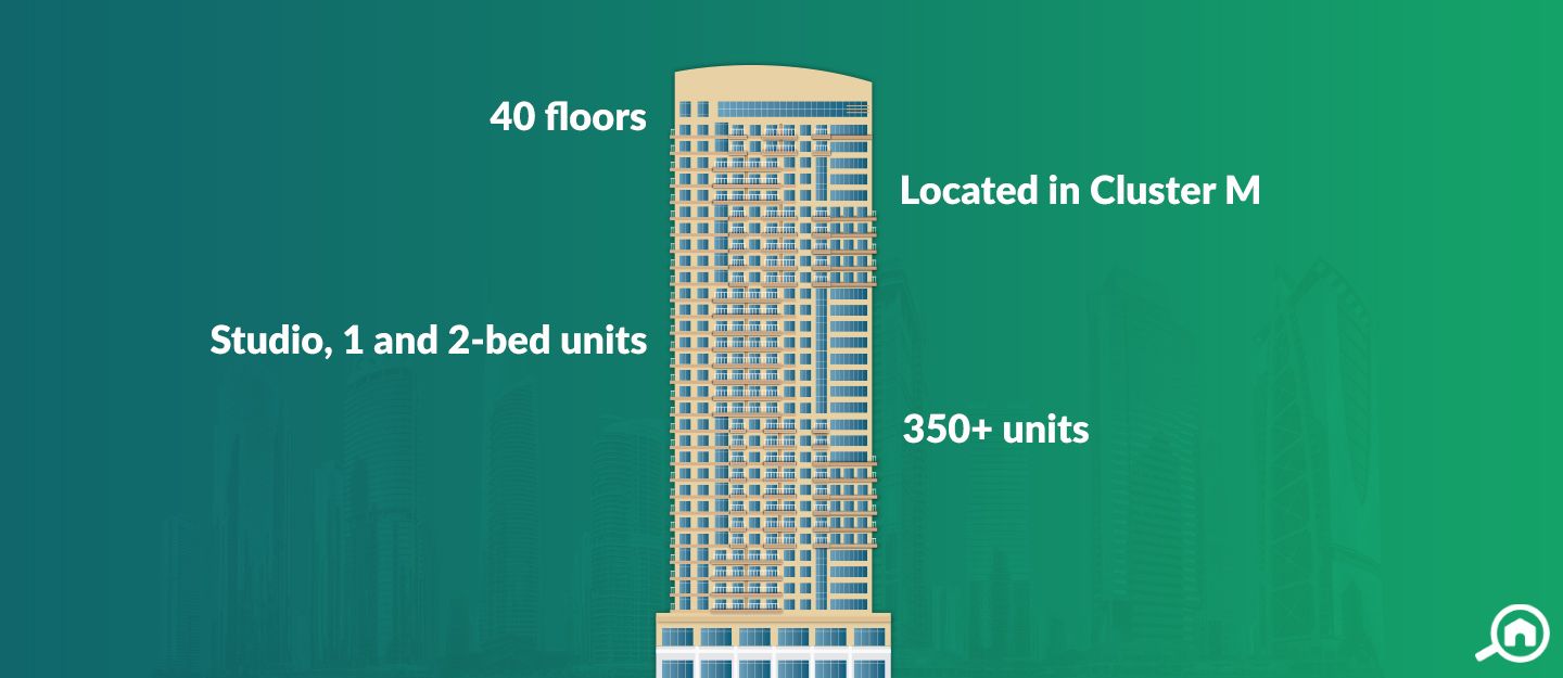 Icon Tower 1 is a residential building in Jumeirah Lake Towers (JLT). Its architectural height is 151 metres and it features 40 floors above ground and 3 floors below ground. There are 400 apartments in Icon Tower 1 and these come in studio, 1-bed and 2-bed configurations. The building’s construction began in 2005 and was completed in 2008 and it is a project of Mazaya Holding Company. It is located within the territory of Cluster M but is also quite close to Cluster L. The tower is situated along First Al Khail Street that connects it with main Sheikh Zayed Road (E11).