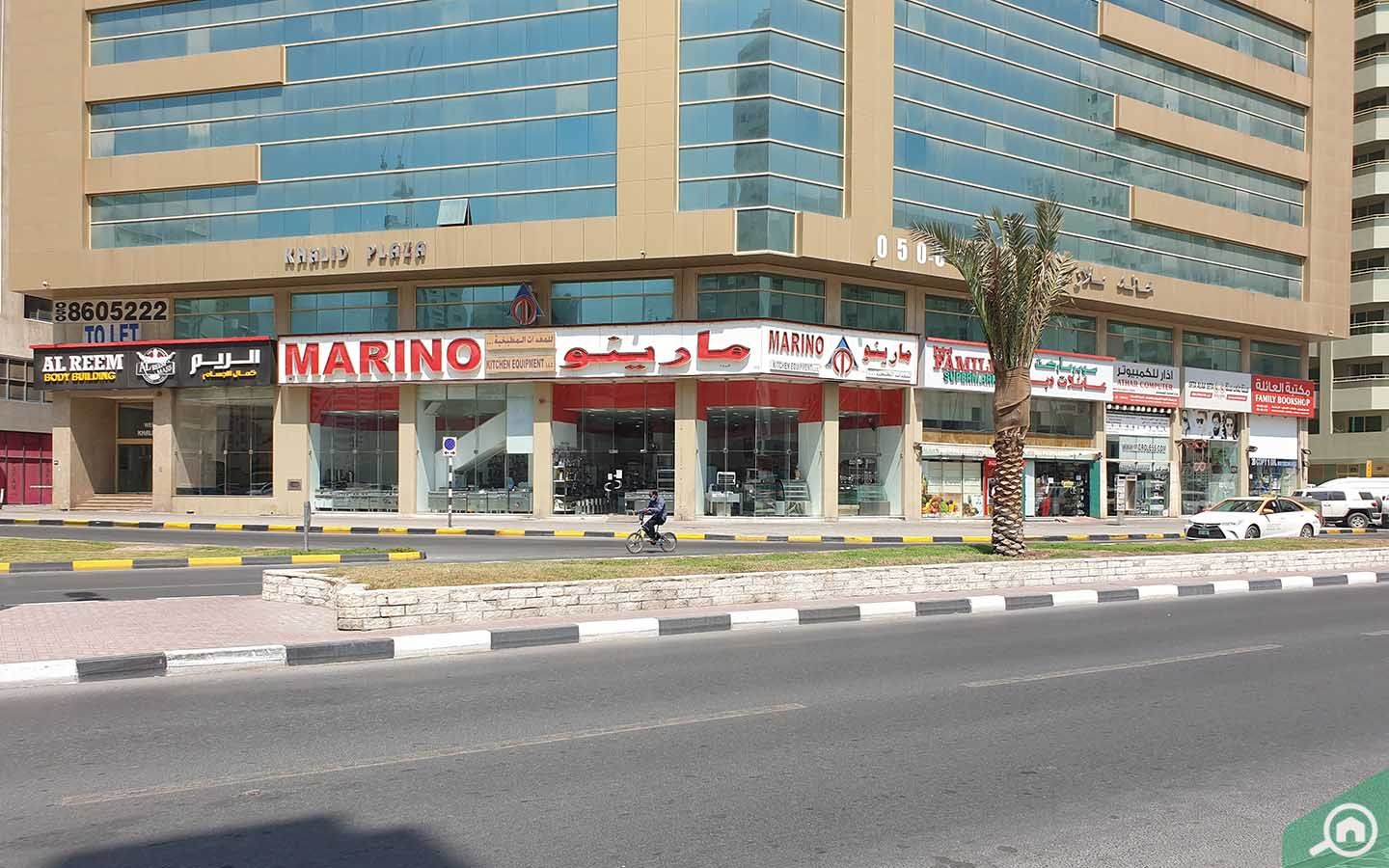 Khalid Plaza has a supermarket and a bookshop on the ground floor of the building.