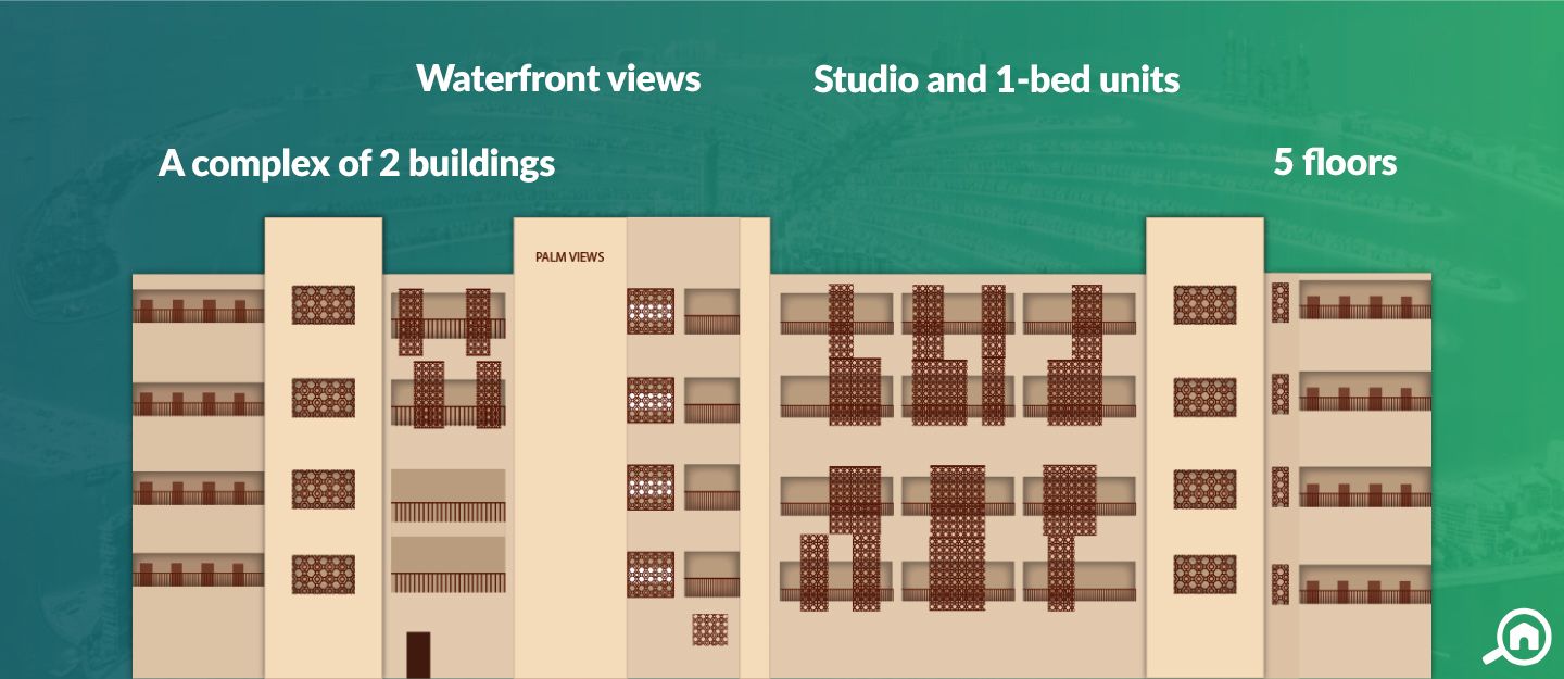 Palm Views Palm Jumeirah, as stated earlier, is a two-building complex featuring two low-rise buildings. Both Palm Views East and Palm Views West offer studio and 1-bedroom apartments.