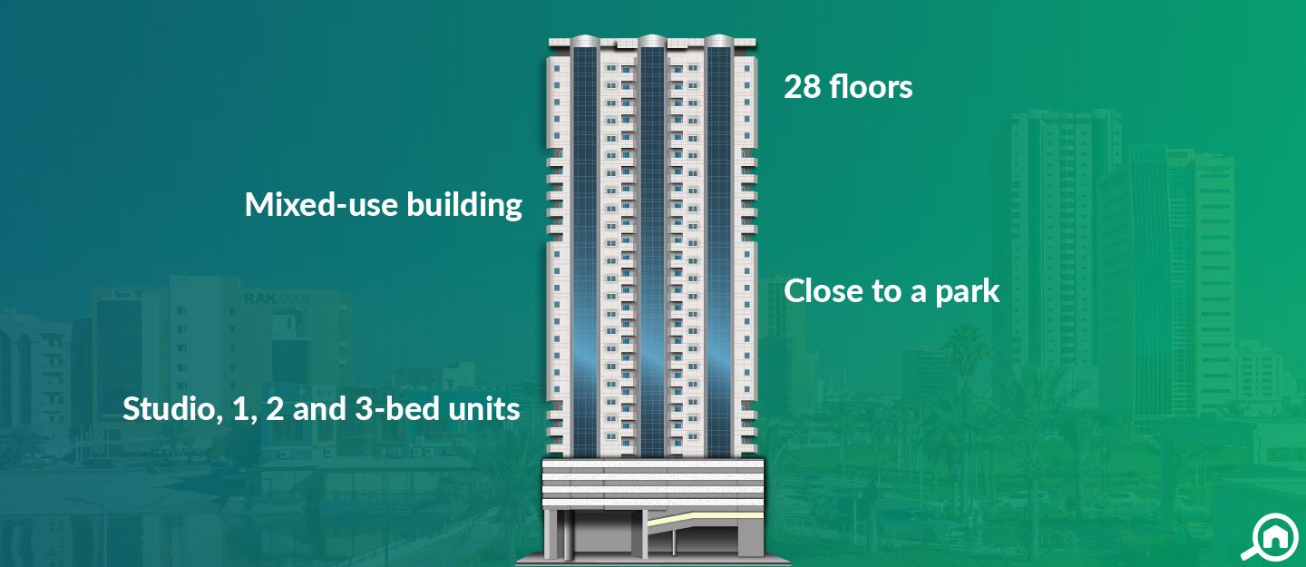 ReadyRAK Tower is a mixed-use building in Al Seer. It has 28 floors including four podium levels. Two floors are dedicated for offices, whereas, 22 floors have above 300 residential units. Apartments in RAK Tower Ras Al Khaimah consist of studios and 1 to 3-bedroom flats. On the ground floor there is a gym, a hypermarket and showrooms.