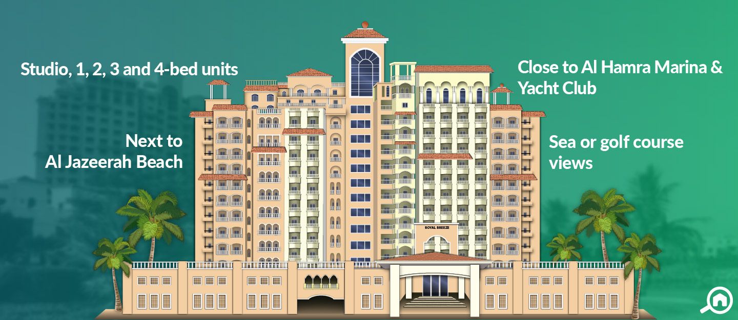 ReadyRoyal Breeze Residences is a five-tower residential complex in Al Hamra Village, Ras Al Khaimah. Located on Royal Street, it offers studio, 1, 2 and 3-bed apartments along with 3 and 4-bed penthouses.