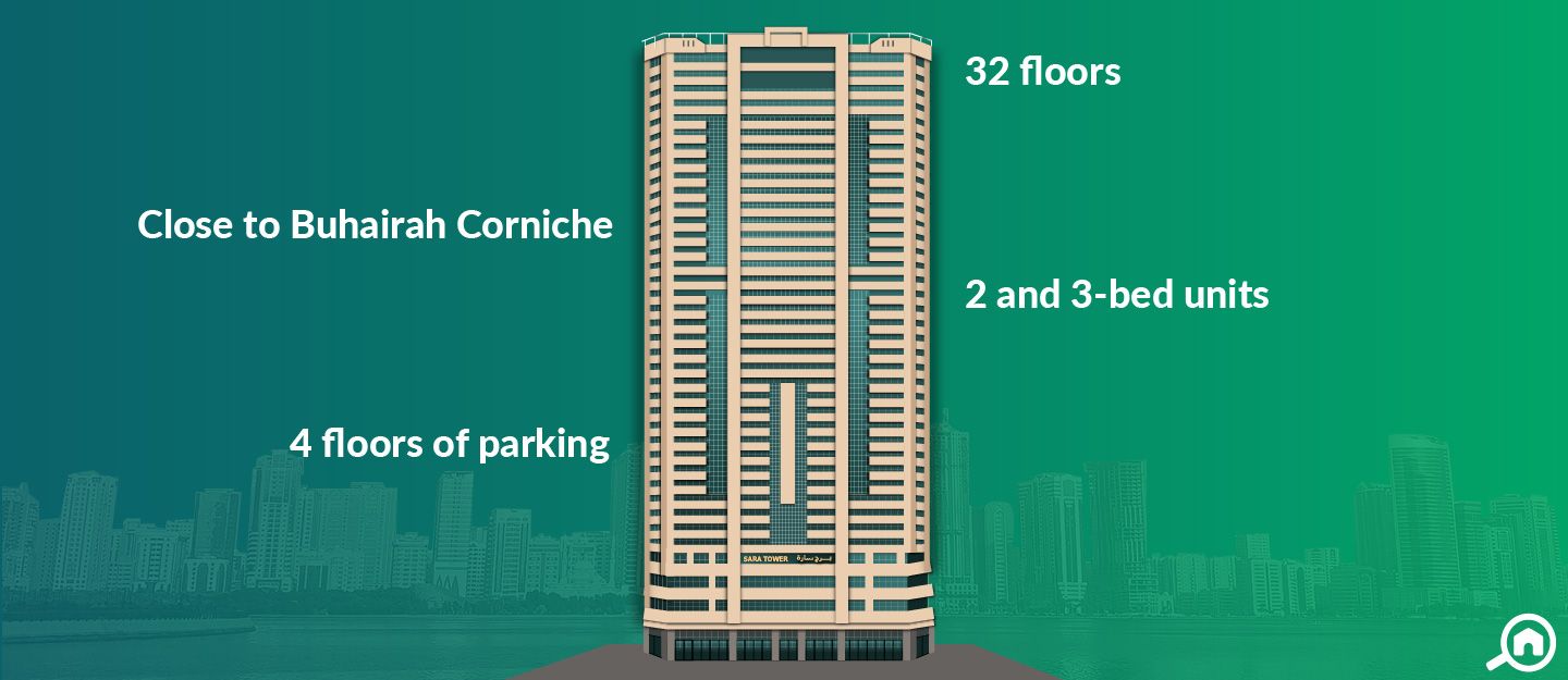 ReadySara Tower is a residential project, located in Al Majaz district. It is a 126-metre high skyscraper, featuring spacious 2 and 3-bedroom apartments. This 32-storey residential building was developed in 2001. The ground floor of this building, along with the first three floors, are dedicated to parking.