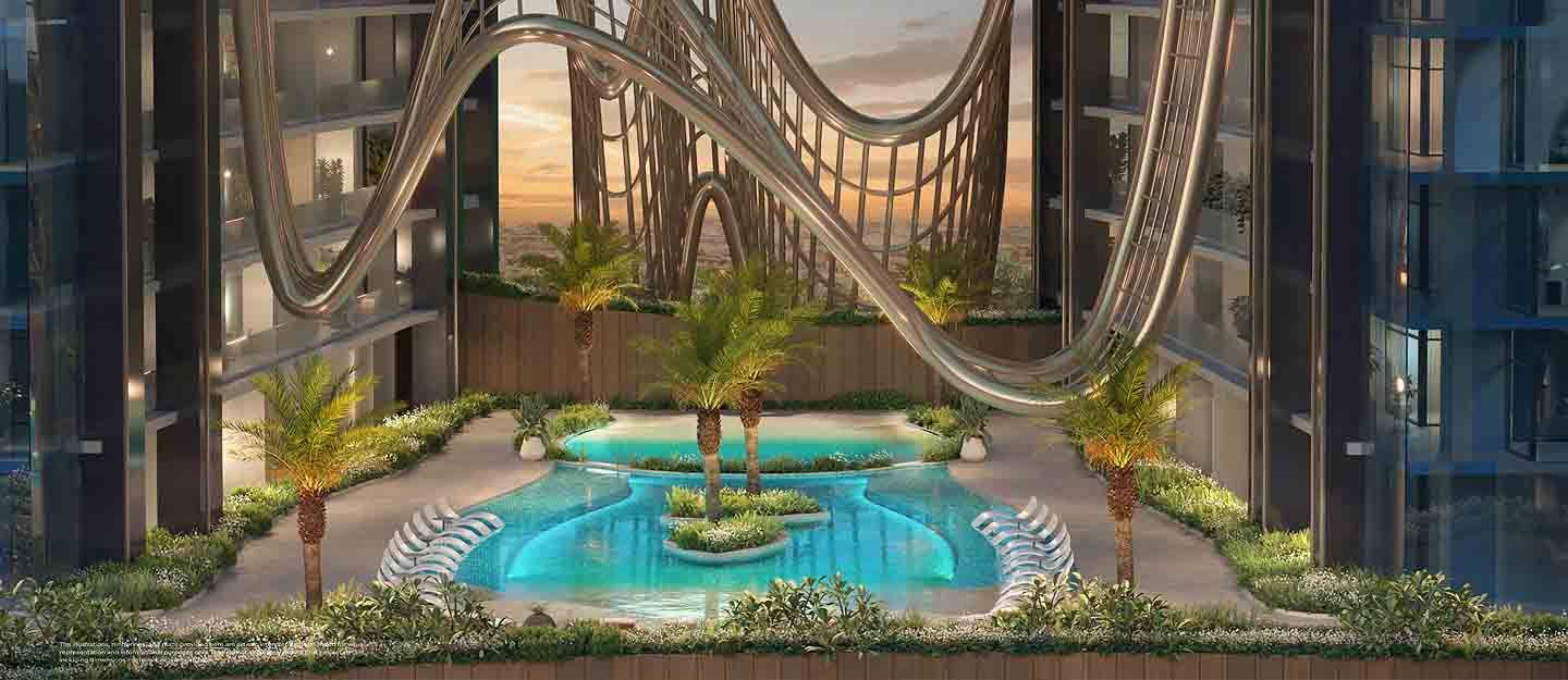 Residents of the complex will share communal amenities like a 352m jogging track, a beach pool lined with sunbeds, a lazy river pool, a lap pool, a kids' pool, a beach volleyball court, indoor and outdoor gyms, a play area for children, dedicated sport for yoga, outdoor terrace and seating space, BBQ area, co-working space, spa and sauna rooms.