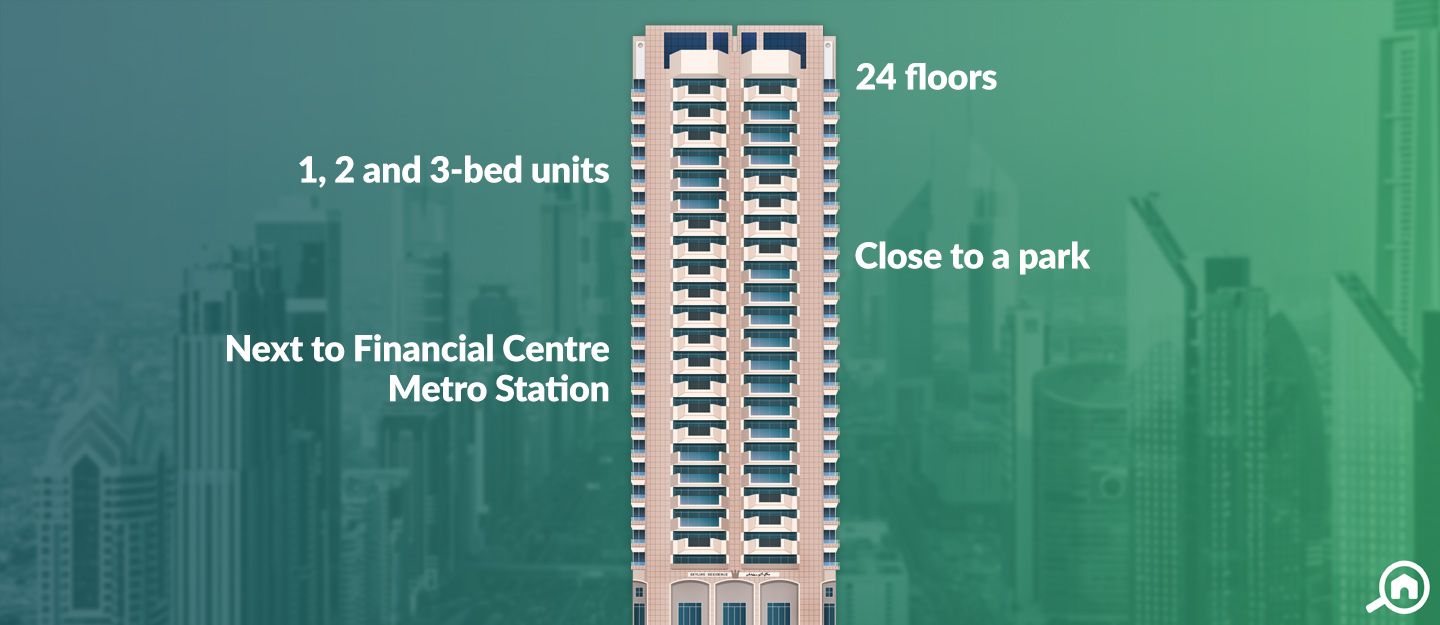 Financial Centre Metro Station served by the Red Line of Dubai Metro is a 2-minute walk from the tower.