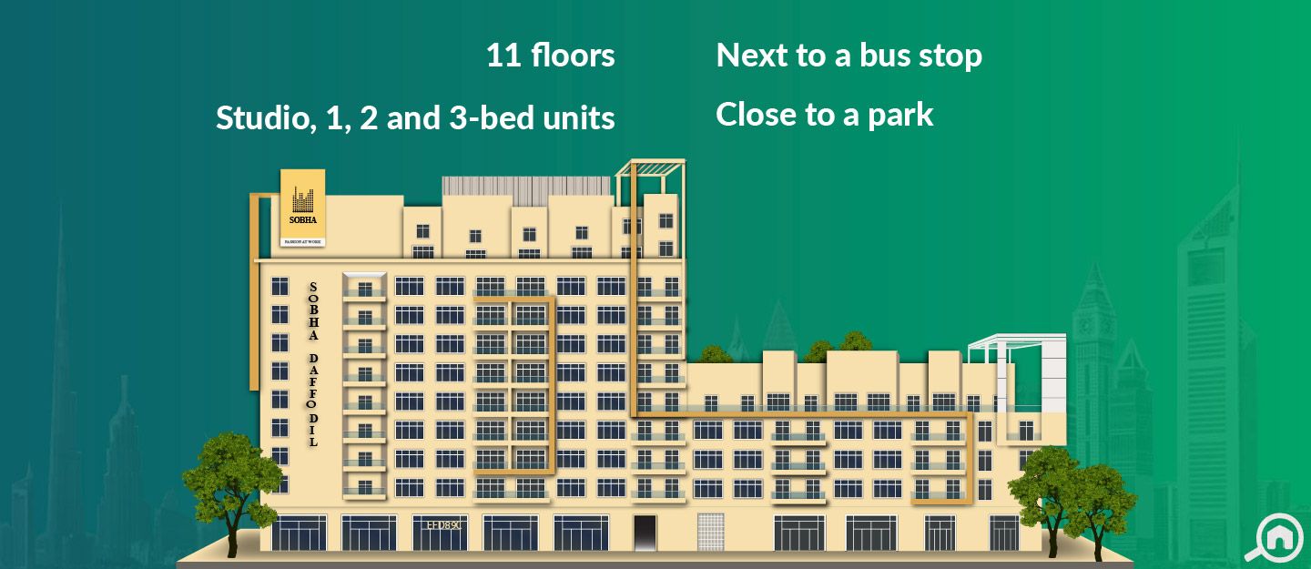 Sobha Daffodil features studio, 1, 2 and 3-bedroom apartments.