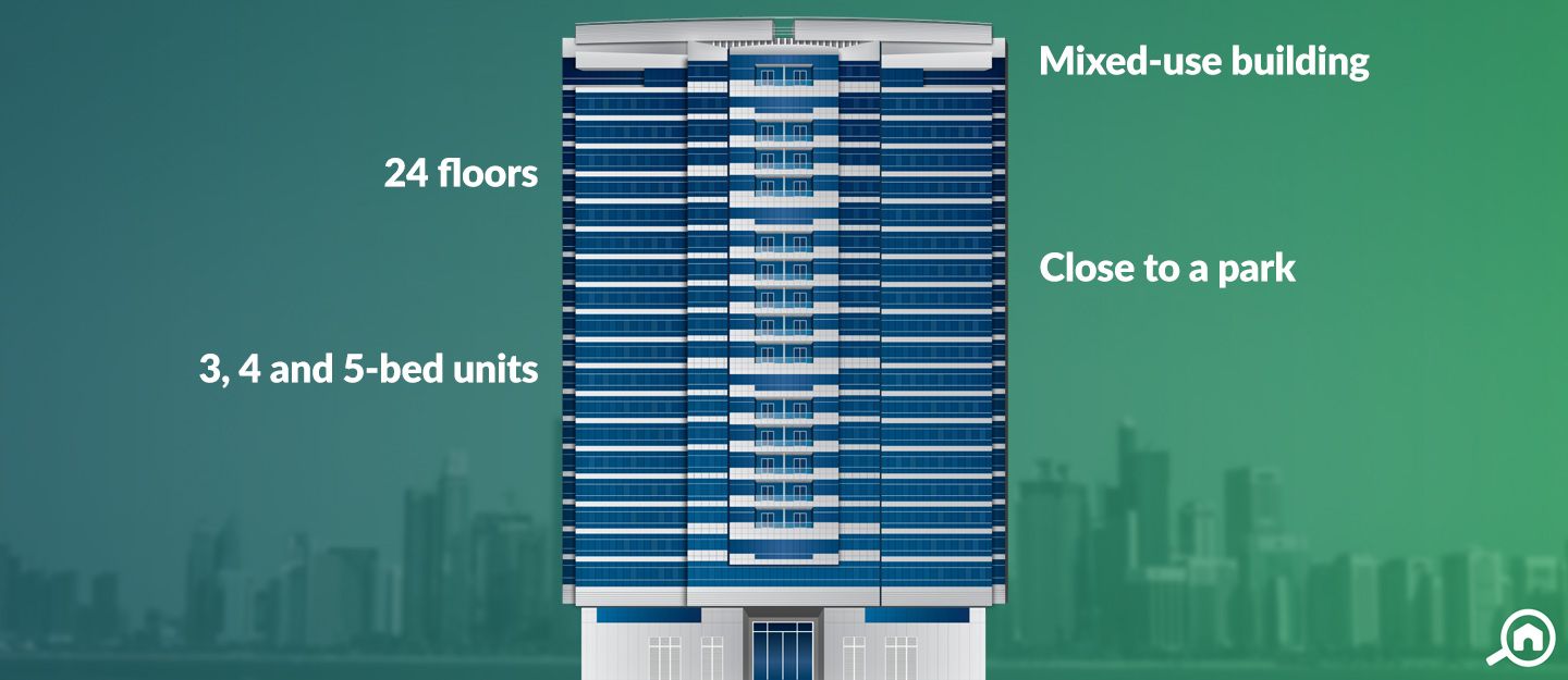 Amama Tower is another residential building, consisting of 18 floors in total. Featuring 4-bedroom units, residents of this building enjoy a wide variety of amenities, including a gym, a swimming pool and covered parking spaces.