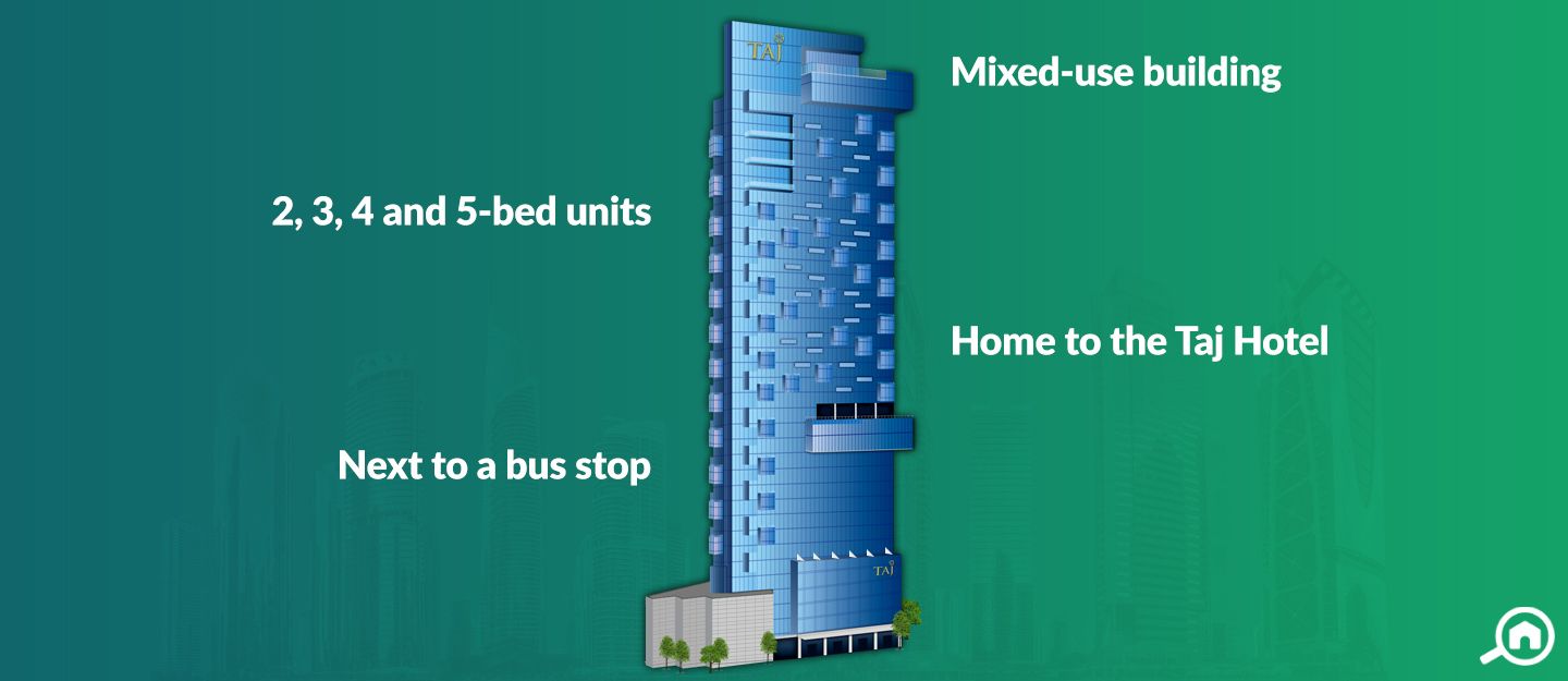 Taj Hotel is a 5-star hotel that occupies the first 18 floors of the tower. Featuring a total of 200 suites, it is developed by Taj Hotel Resorts.
